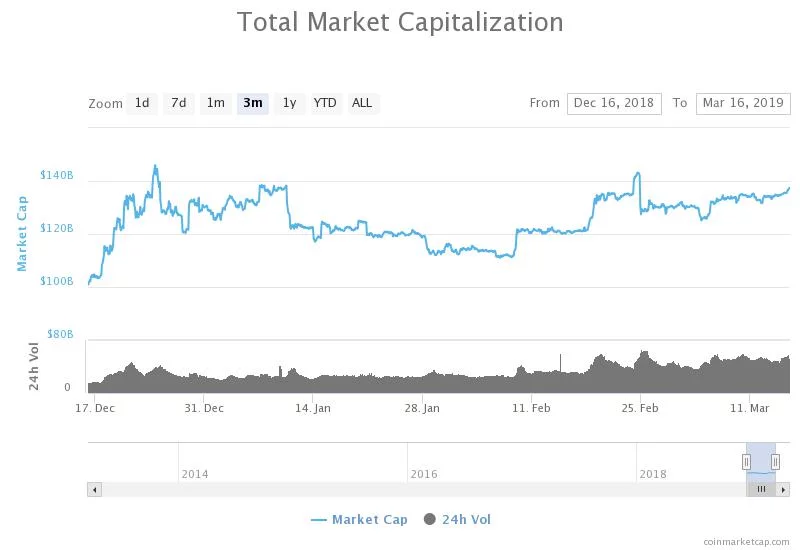 在过去的一周里,随着比特币价格小幅回升至4000美元,数字货币市场的市值从1310亿美元上升至1370亿美元。